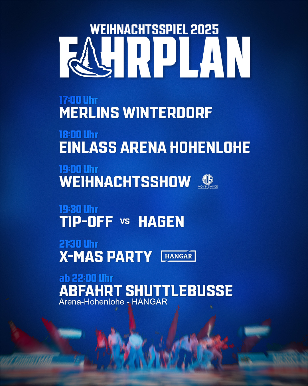 Alle Jahre wieder erstrahlt die Arena Hohenlohe am Tag vor Heiligabend für das berühmte Weihnachtsspiel – und dieses Jahr wird den Besuchern besonders viel geboten. Bereits vor Hallenöffnung können sich die Fans beim Merlins Winterdorf weihnachtlich einstimmen, bevor mit einem magischen Rahmenprogramm von Movin Tanz + Fitness das Spiel eingeläutet wird. Zur Abrundung des Tages findet nach Spielende wie jedes Jahr die geilste Party des Jahres statt! Um 21:30 Uhr öffnet der HANGAR Event Airport Crailsheim die Türen für die diesjährige X-MAS Party.