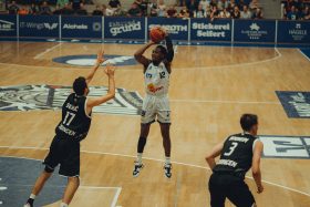 Nürnberg, 03.09.2023. Finale beim Vorbereitungsturnier in Nürnberg! Nach den Halbfinalsiegen der Zauberer und der Unterfranken trafen nun die HAKRO Merlins auf die Würzburg Baskets. Die nur knapp 24 Stunden Pause merkte man beiden Teams zu Beginn an, die Anfangsphase des Testspiels war auf beiden Seiten von Fehlern geprägt. Doch in der Folge wirkten die Crailsheimer spritziger und eingespielter. Angeführt von Forward Murray-Boyles (13 Punkte zur Halbzeit) konnten sich die Merlins einen Vorsprung herausspielen, kurz vor der Halbzeit übernahmen jedoch die Franken, sodass die Merlins mit einem knappen 35:39-Rückstand in die Pause gingen.